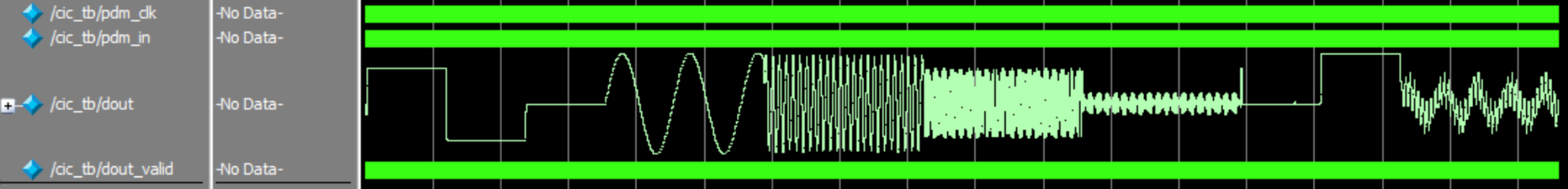First and foremost, we have the Figure 12 waveform outputs of our CIC filter. Here, a PDM input with various 1/0 densities represents a +1, -1, 0, sin(500), sin(5000), sin(15000), and sin(30000), along with an impulse, a step response, and a mixed signal of a combined 1000, 8000, and 25000 Hz. You can see that the 1-bit signal is converted into a 16-bit, 64 kHz signal with the 15 kHz and 30 kHz attenuated out, as expected.