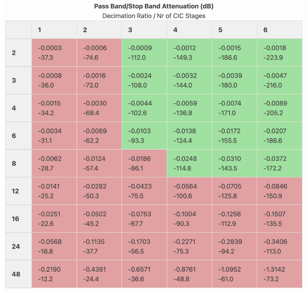 Initially, we were naively hoping to create a decimation ratio of 144, bringing a PDM input rate of 2.304 MHz down to 16 kHz. This was due to a misunderstanding of half-band filters and the resources we could fit onto the board. Half-band filters are optimized FIR filters that require only half the number of taps, and therefore multiplications, but also can only decimate (or interpolate) at a rate of 2 every filter. We had assumed that half-bands filters would be able to handle 3x and 4x decimation (which, no, is not possible) during the project proposal stage. Once we read up more on half-bands, we decided to move to a 1.536 MHz to decimate it down to 16 kHz using a decimation ratio of 96. We determined that, for our purposes, the CIC filter would be able to handle a 24 decimation ratio without much change in ripple or attenuation via this Figure 5 chart: