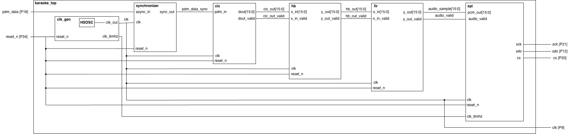 The top module is karaoke_top.sv, as found in the GitHub’s fpga/src. The FPGA feeds the PDM signal through a pipeline of 3 digital audio filters: a CIC filter / cic.sv, half-band filter / hb.sv, and FIR filter / fir.sv.