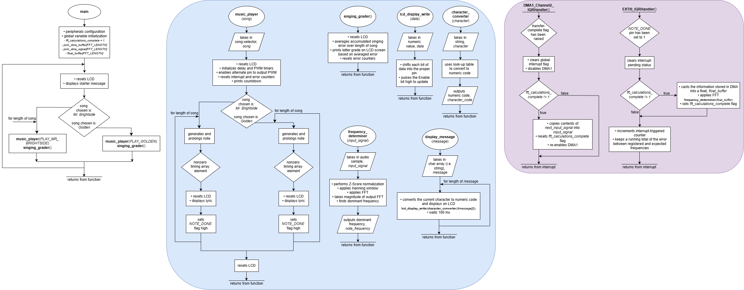 The Figure 8 flowchart provides a detailed overview of the microcontroller’s most significant routines. This is a visual depiction of the peripherals discussed in section MCU Design Overview above. In summary, there is a main loop that continuously polls for the user’s song selection; when a song is eventually chosen, the music_player() function outputs each note using PWM-generation and delay functions, interrupting after every note is done playing to FFT the user’s voice and subsequently determine their error. There is also an occasional interrupt that tells the program to output new lyrics on the LCD. Finally, the singing_grader() function informs the user of their error, before starting the process anew.