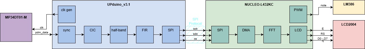 Finally, once we got almost everything working regarding the MCU peripherals and the FPGA SPI module, we had some issues where, even in ambient noise, the microphone, filters, and FFTs combined would produce outputs ranging from 100 to 6000 Hz, jumping values multiple times in a second. We knew from verification and testing that all of these mechanisms should work in isolation, so we weren’t sure where the mix-up was coming from. In a last-ditch test to see if the ambient noise was too much (which it wasn’t), we left the lab to go to a quieter room. It turns out that synthesizing and loading the executable from Quinn’s personal computer through OpenFPGALoader fixed completely all of our issues despite using the same exact code and project setup (same .rdf files for Lattice, same Lattice version). There may be some timing constraints that we never specified that could be causing these mapping inconsistencies, but overall, we are still unsure exactly why this is. However, as a result, the microphone and FFT are now able to accurately detect and output frequencies.