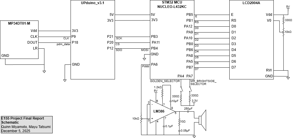 Furthermore, the MCU-audio-amplifier-speaker circuit shown at the very bottom is yet another component taken from Lab 4, affording the users the ability to modify the speaker’s volume.