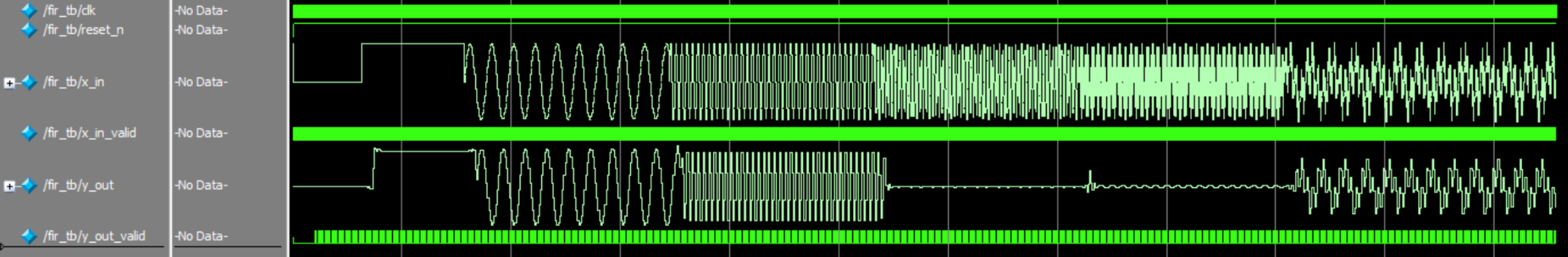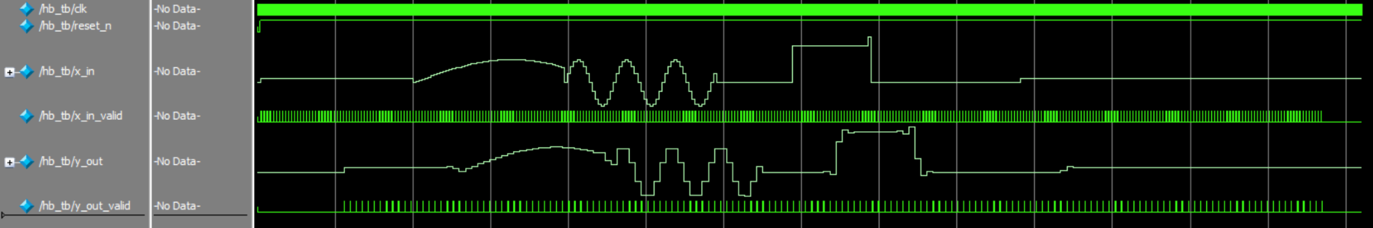 Next, we have our half-band filter in Figure 13. You can see that the validity signal, passed in at 64 kHz, is decimated by 2 down to 32 kHz (compare x_in_valid and y_out_valid). You can also see the same in the signals that are passed through, along with some latency.