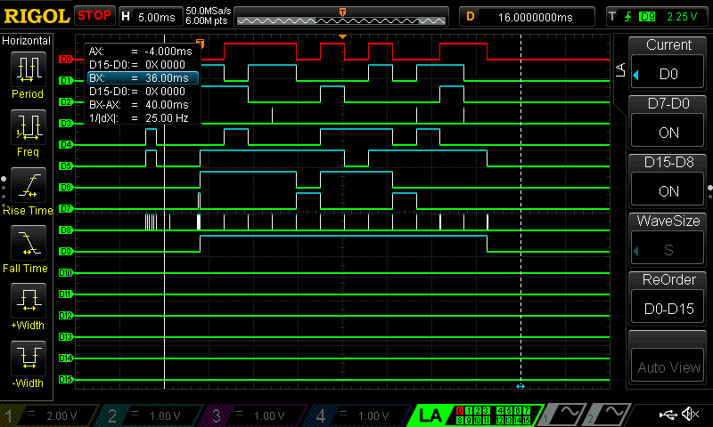 Last but not least, we used a Logic Analyzer in Figure 16 to aid us in proving that the LCD works as expected. Here, we tried to write the message “uPs!” on-screen, which corresponds to binary codes of “01110101,” “01010000,” “01110011,” and “00100001,” respectively (with the most significant bit being what is passed in to D7 and the least significant bit being passed into D0). Evidently, we can see that after RS goes high for the first time (which is actually signified on D9 in the above image), the traces match exactly what we expected.