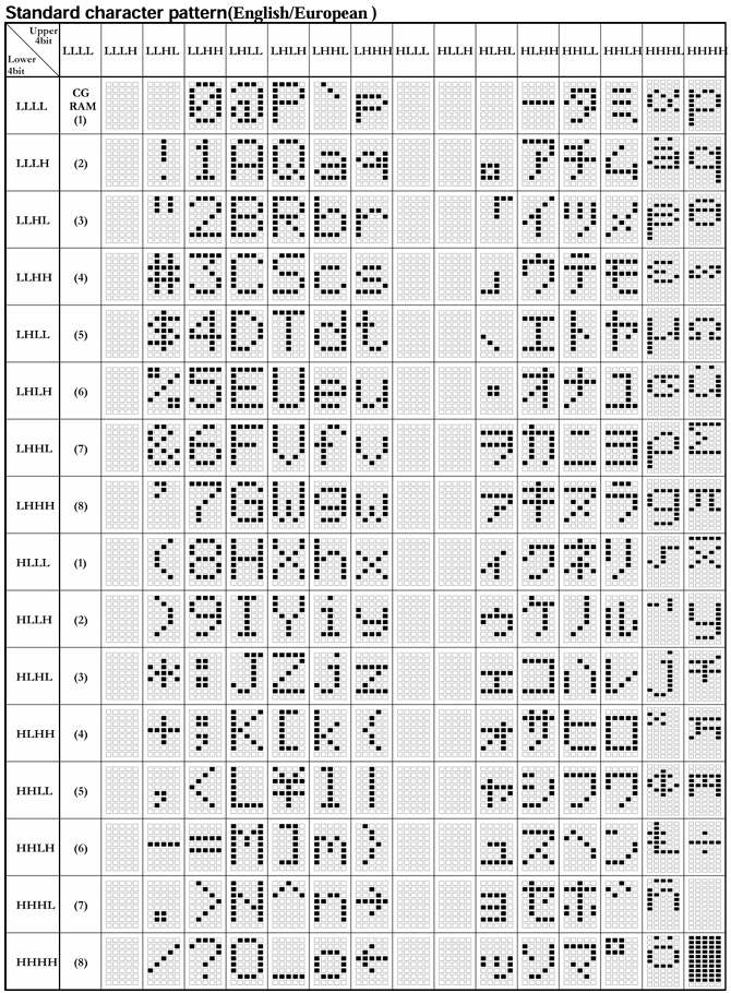 More specifics about these pins and their respective functionalities can be found in the datasheet for the LCD’s Hitachi controller, specifically. Regardless, for both methods of communication, the module uses the sequences of high and low voltages detected in tandem with a look-up table, with each operation having its own lead-in op-code (such as the Set Address and Clear Display functions) and each character having its own unique sequence associated with it. The latter can be viewed rather clearly in Figure 2, as follows: