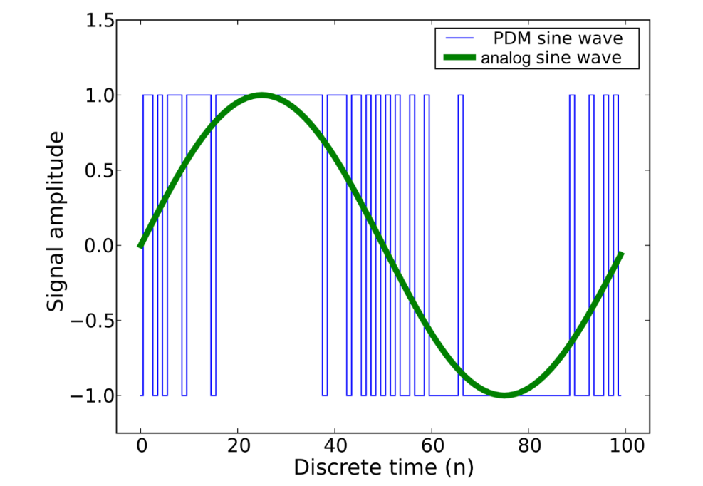 We used a MP34DT01-M, a MEMS digital microphone. It outputs data in Pulse-Density Modulation (PDM) format, which is a format of representing an analog signal in a single bit, with the density of 1’s and 0’s reflecting the amplitude of the signal.