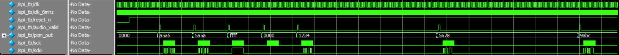 Finally, with the Figure 15 image, we can see evidence of our SPI transaction’s success. We passed in values through pcm_out, and you can see the correct values being passed through SCK (though only 0x0000, 0xFFFF are easy to read). The SPI runs at 3 MHz, but realistically, after the three filters, expected outputs come out at a frequency of 16 KHz, which is the width between inputs of 0x1234, 0x5678, and 0x9abc (so you would see this speed on the logic analyzer being fed into the MCU).