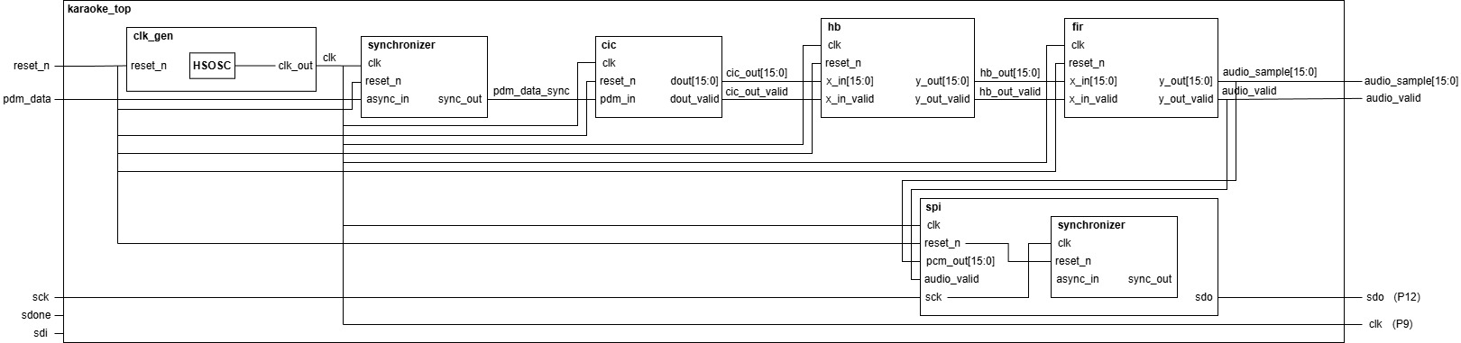 As of this project’s midpoint checkoff (11/20/25), the microphone is somewhat functional and sends audio samples to the FPGA board as desired. The FPGA then performs decimation on the signal by applying one CIC filter, one half-band filter, and one FIR filter, in that order. The CIC filter first decimates the 1.536 MHz PCM input by a factor of 12 through 4 stages to output a 64 kHz 16-bit PCM. The 4 initial integrator blocks accumulate the PDM stream while the decimator takes one out of 12 values. The 4 combs then compute successive differences between delayed samples, which means that they effectively undo the integrator buildup and restore a band-limited approximation of the original signal at the lower sample rate. The half-band filter is a fancy and more efficient FIR filter, using the properties of specific coefficients to halve the number of multiplications and make it more resource-efficient. The coefficients for the half-band were found by specifying a desired passband of 3950 Hz and stopband of 7900 Hz, along with a set decimation ratio of 2 (as half-bands are hardcoded to have) and number of taps, and passed all those parameters into the remez Python function. Essentially, we used this half-band filter to lower the resource strain and still decimate by 2 so we went from a 16-bit 64 kHz PCM to a 32 kHz 16-bit PCM. The FIR filter coefficients were found by calculating the passband ripple and stopband attenuation that results from the first CIC and halfband filters, and specifying the targeted values (around +- 3dB ripple and 60 dB attenuation at least). The FIR filter also had a decimation ratio of 2 to bring down the final frequency to 16 kHz (with a Nyquist of 8 kHz) that maintains all signals required ot distinguish tones during singing. All filters have a one-cycle output pulse that is asserted when there is a new valid value available. This is passed in to the SPI module, along with the final 16-bit and 16 kHz decimated PCM values, to be sent to the MCU.
