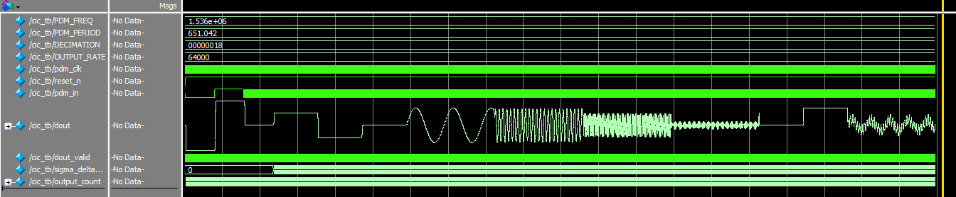 This process of figuring out the coefficients was extremely difficult due to differences between what we had planned and what was possible. We had originally planned for a 144 decimation ratio starting from a 2.304 MHz PDM rate, with 2 halfbands (x4, x3) in between the CIC (x12) and compensation FIR filter (x1). However, we were not aware that halfbands were only as efficient as they are when they are at x2 decimation. Then, given the limited resources on the FPGA and the slowly mounting number of LUTs as we implemented the filters, we came to the decision that only a single halfband (x2) filter would be possible. Our final plan was the 12x, 4-stage CIC filter, than a single halfband (x2) filter, and the final compensation FIR filter that also decimated by 2. Every single iteration of this pipeline required re-calculating feasible coefficients for the halfbands and FIRs, which took effort and learning of a new section of the matplotlib library in Python. It also took a while implementing a pipeline on the halfband and FIR filters, along with shift-adding to reduce multiplication and, in extension, resource usage.