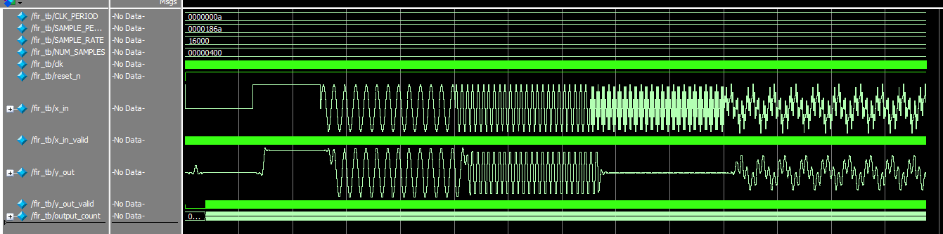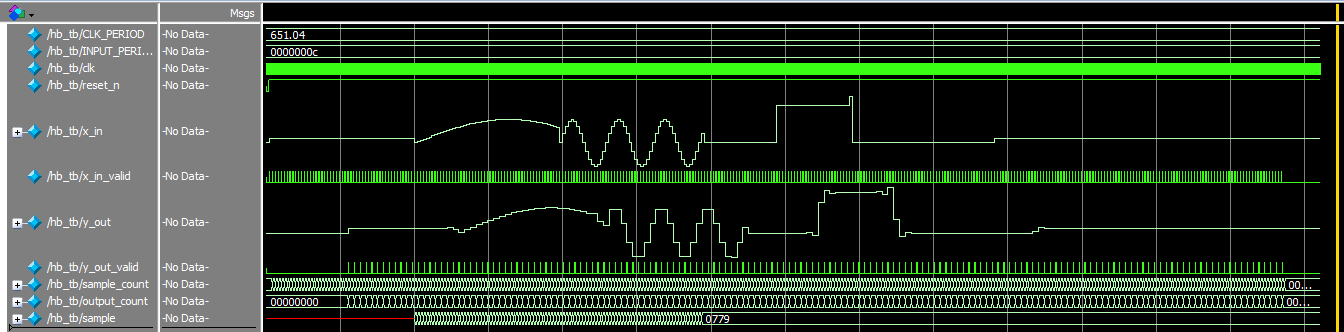 From here on out, the team will need to get the LCD and speaker(s) working and properly interfaced with the current system, such that various songs and their lyrics can be played and displayed, respectively. There will also need to be some sort of song-selection mechanism integrated into the process. Moreover, the team has a few timing/latency concerns — regarding the delay between input audio signals and their processed outputs, in particular, as displayed in the verification waveforms below — that will need to be addressed. However, because the riskiest element of the project has already been successfully implemented, completing the rest of these tasks should not be as big of a problem.