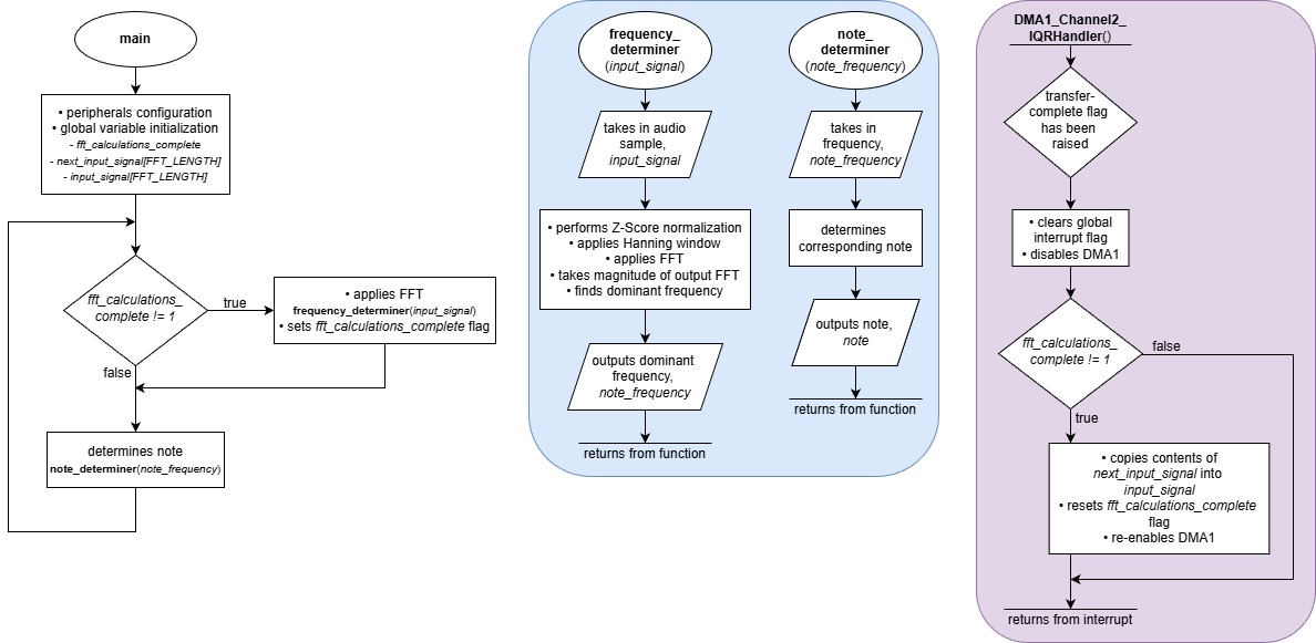 First and foremost, the main loop’s primary jobs are to 1) configure the MCU and all of its relevant peripherals, 2) continuously apply an FFT to the detected audio samples — which are, again, transmitted to the controller via SPI — in order to determine the dominant frequencies, and 3) output the corresponding note. This notably requires the help of two custom functions, frequency_determiner and note_determiner. The former makes use of the ARM math library to actually perform the FFT calculations (with some pre-processing work done to ensure greater accuracy and resolution), after which an fft_calculations_complete flag is set. Meanwhile, the latter comprises what is essentially a look-up table to output the dominant frequency as a note that is in human-readable terms. Finally, the DMA1_Channel2_IRQHandler deals with any interrupts that trigger as a result of the SPI-to-DMA-transfer-complete flag being set. More specifically, it waits until the fft_calculations_complete flag is high to copy the contents of the SPI data register (i.e. whatever audio sample the FPGA is sending over at the time) to a second buffer, named input_signal, for frequency_determiner to subsequently process; then, it resets the fft_calculations_complete so that the process may begin anew.