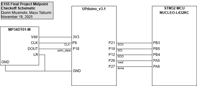 Figure 2 above depicts all of the components comprising the breadboarded circuit at the time of the midpoint checkoff. This includes the PDM microphone, FPGA, and MCU; note that while the connections between the FPGA and MCU did not need to be explicitly outlined, as they are both on-board elements of the PCB that are hooked up internally, these were shown for the sake of clarity, especially regarding the SPI transactions. Overall, the microphone and FPGA interfacing was done in accordance with the MP34DT01-M datasheet. The most prominent feature of note is the tying of the LR port to ground, as that configures a DOUT signal pattern of valid data when the CLK signal is low and high impedance when CLK is high.